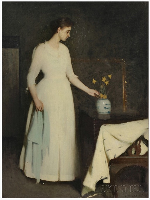 For nearly fifty years the painting hung at the top of the Library’s stairs. However, as the price for Benson’s paintings enjoyed a meteoric rise, the Library’s Board became concerned for the safety of such a valuable work. It has been locked away for more than a decade. This winter, the Trustees decided that, if they could not display it for the public’s enjoyment, they should sell it at auction. They consigned it to Skinner’s in Boston. It did not sell. I’m not just sure quite why. The online description states that there are areas of cracked painting and that the work is dirty. Nothing that a bit of restoration and cleaning could not cure. The handsome gilded frame may well be the work of one of the famed Boston framers who later created made-to-order frames for some of Benson’s best known Impressionist works of his daughters in white dresses standing on a Maine hillside.